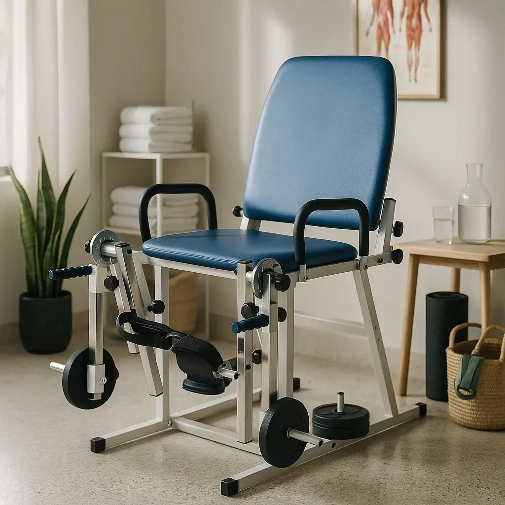 Quadriceps exercise chair designed for safe knee strengthening and mobility work. Adjustable resistance, supportive backrest, and secure straps suit early rehab to strength phases. Ideal for physiotherapy clinics and home setups across Nairobi and Kenya. Helps target quadriceps and hamstrings with controlled leg extension and curl motions. Durable medical upholstery and steel frame for daily, hygienic use. Build confidence step by step with stable, guided movement.